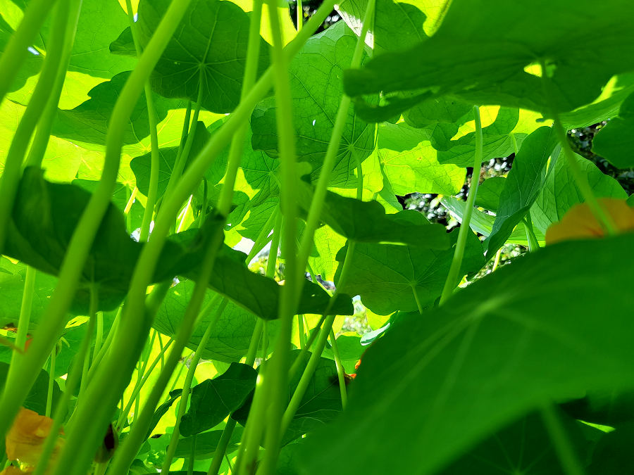 Heute bei TomatOS: Im Pflanzcontainer entfaltet die Kapuzinerkresse auf nur einem Quadratmeter im sommerlichen Abendlicht ihre eigene kleine Blätter- und Blütenwelt in Rot, Orange, Gelb und Hellgrün.